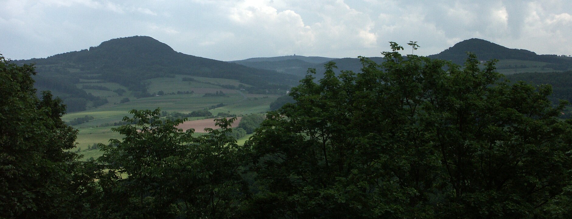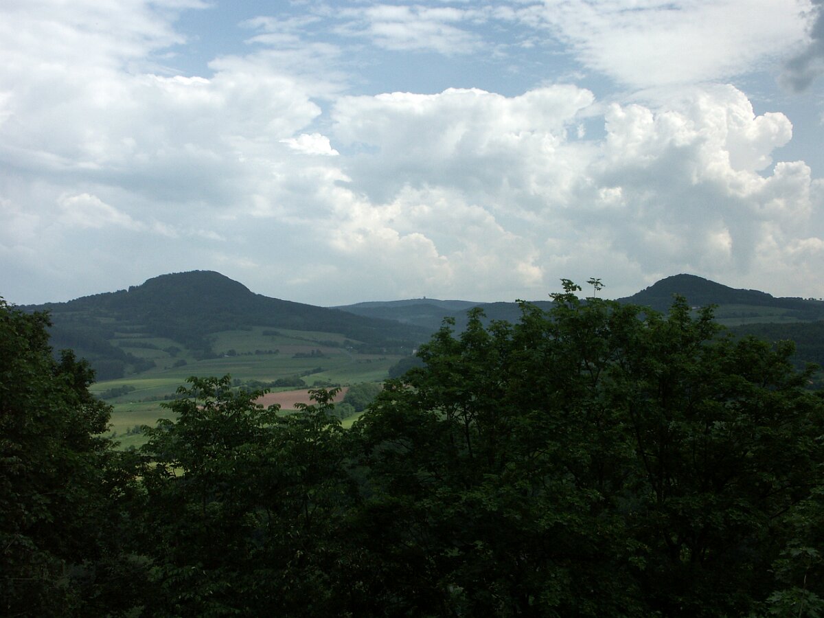 Links Milseburg, rechts Stellberg und im Hintergrund die Wasserkuppe