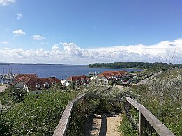 Blick vom Aussichtspunkt Schmiedeberg auf die Haffpromenade und das Salzhaff mit Wustrow