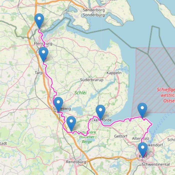 Diese Etappen habe ich im Sommer 1998 als Tagestouren erwandert, wobei ich jeweils zwei Etappen der "Krause-Planung" zusammengefasst habe. Entsprechend der zunehmenden Entfernungen war teilweises sehr frühes Aufstehen und längere Bahnfahrten angesagt. Die über 50 km langen Touren im Norden Schleswig-Holsteins waren noch zu schaffen, aber ich habe die Erfahrung gemacht, dass man auf kürzeren Etappen besser die Landschaft genießen kann. Die gemessene Wanderstrecke von Flensburg nach Kiel beträgt ca. 161 Kilometer.