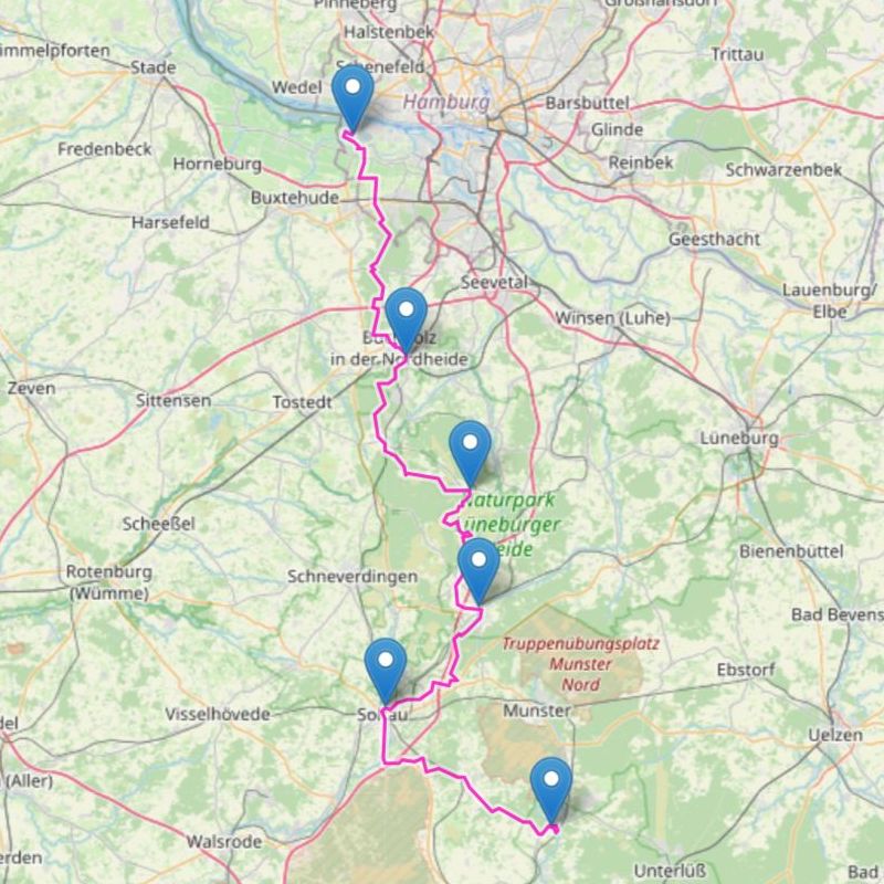 Im Jahr 1997 habe ich meine ersten großen Wanderungen auf dem E1 begonnen. Später bin ich rund um meinen Heimatort diverse Touren zum zweiten Mal gewandert. Die Wanderung von Soltau nach Müden würde ich gerne vielleicht auch in zwei Etappen wiederholen. Die gemessene Wanderstrecke von Cranz nach Müden beträgt ca. 128 Kilometer.