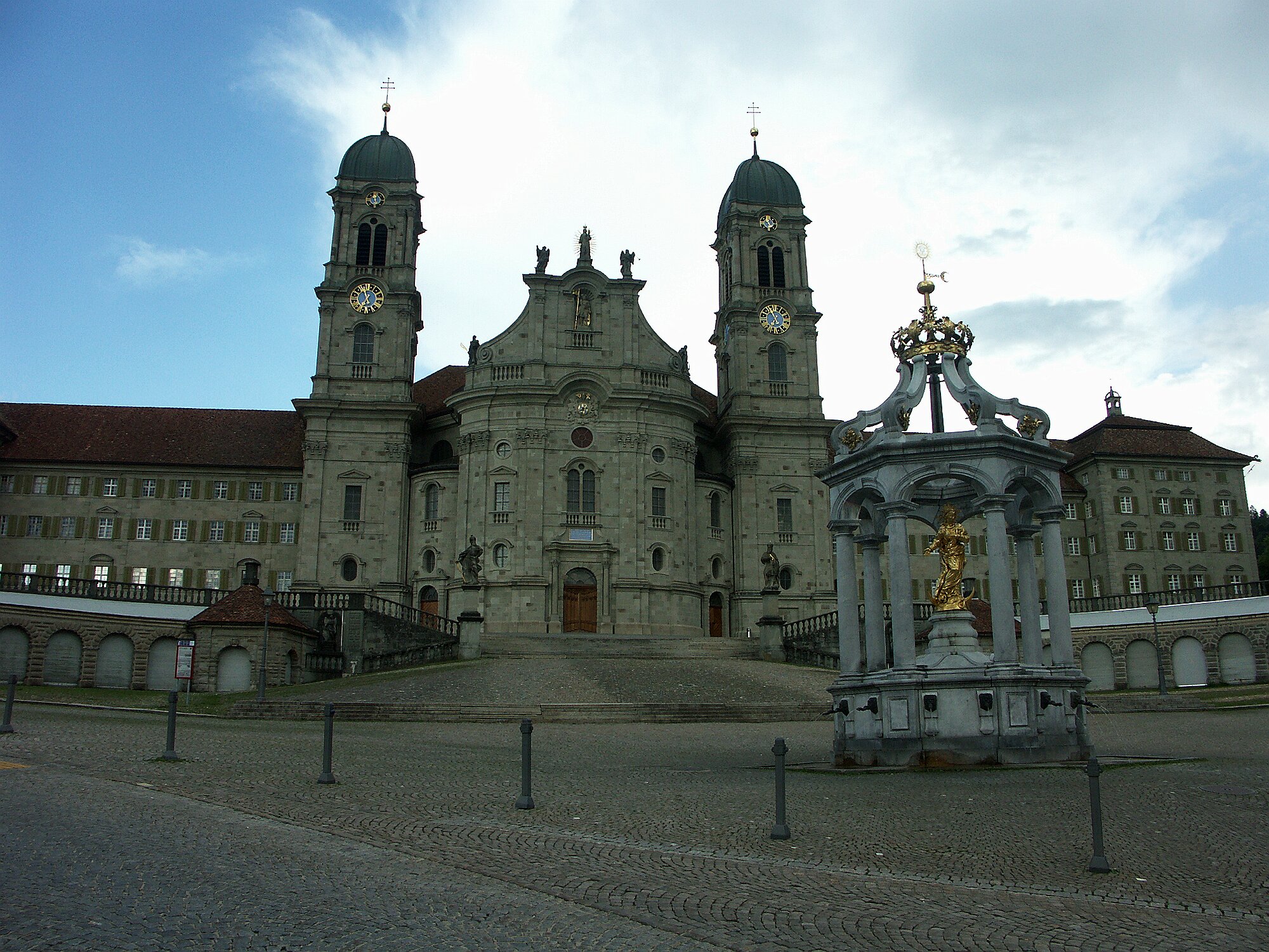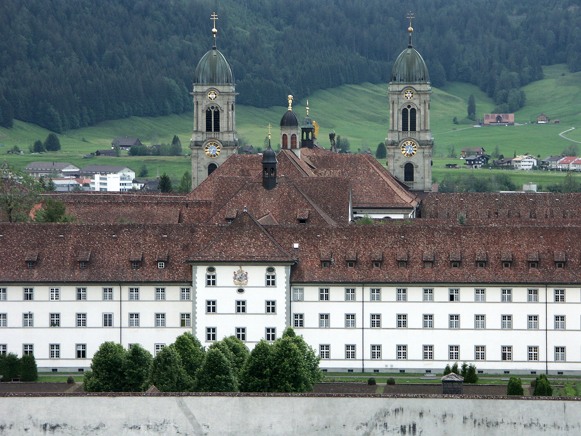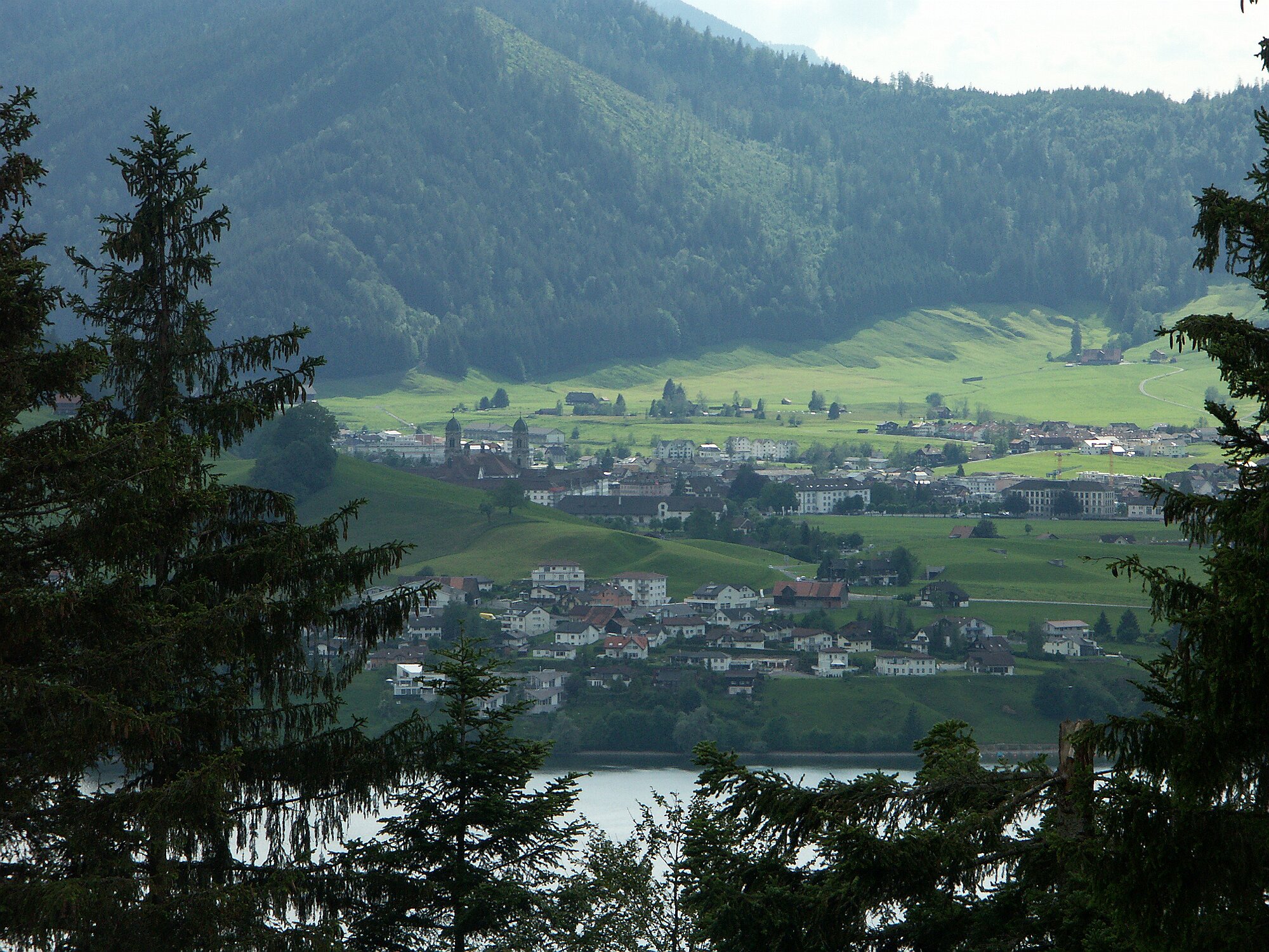 und über das lange Sihlsee-Viadukt zum gewaltigen Kloster sowie zum Dorfplatz.