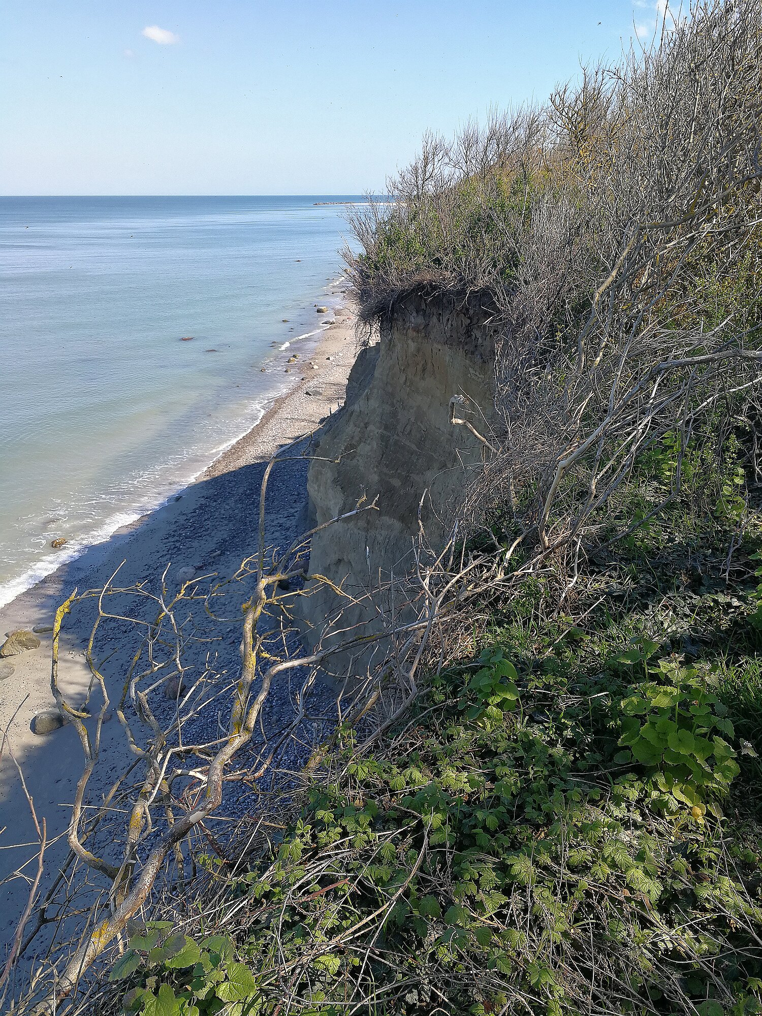 Zum Start der heutigen Etappe gab es Sonnenschein pur. Über den Deichkronenweg ging es zunächst zur Seebrücke von Wustrow. Von dort aus gelangte ich bald zu Resten einer Bunkeranlage von der aus man einen guten Einblick auf die Steilküste hat, die an dieser Stelle von tausenden Schwalbennestern durchlöchert ist. Leider konnte ich hier die inzwischen eingetroffenen Schwalben noch nicht beim Anfliegen ihrer Nester beobachten.