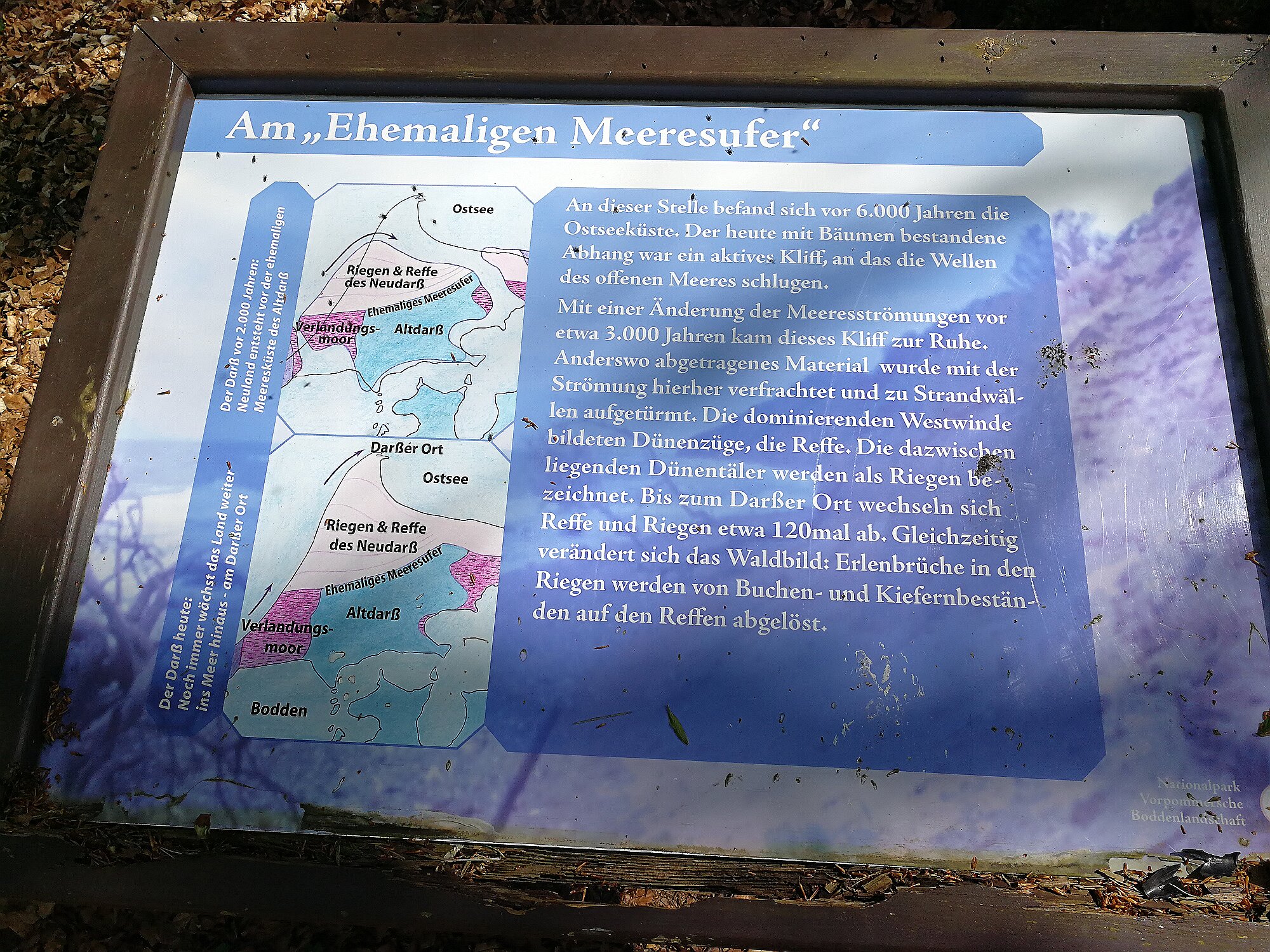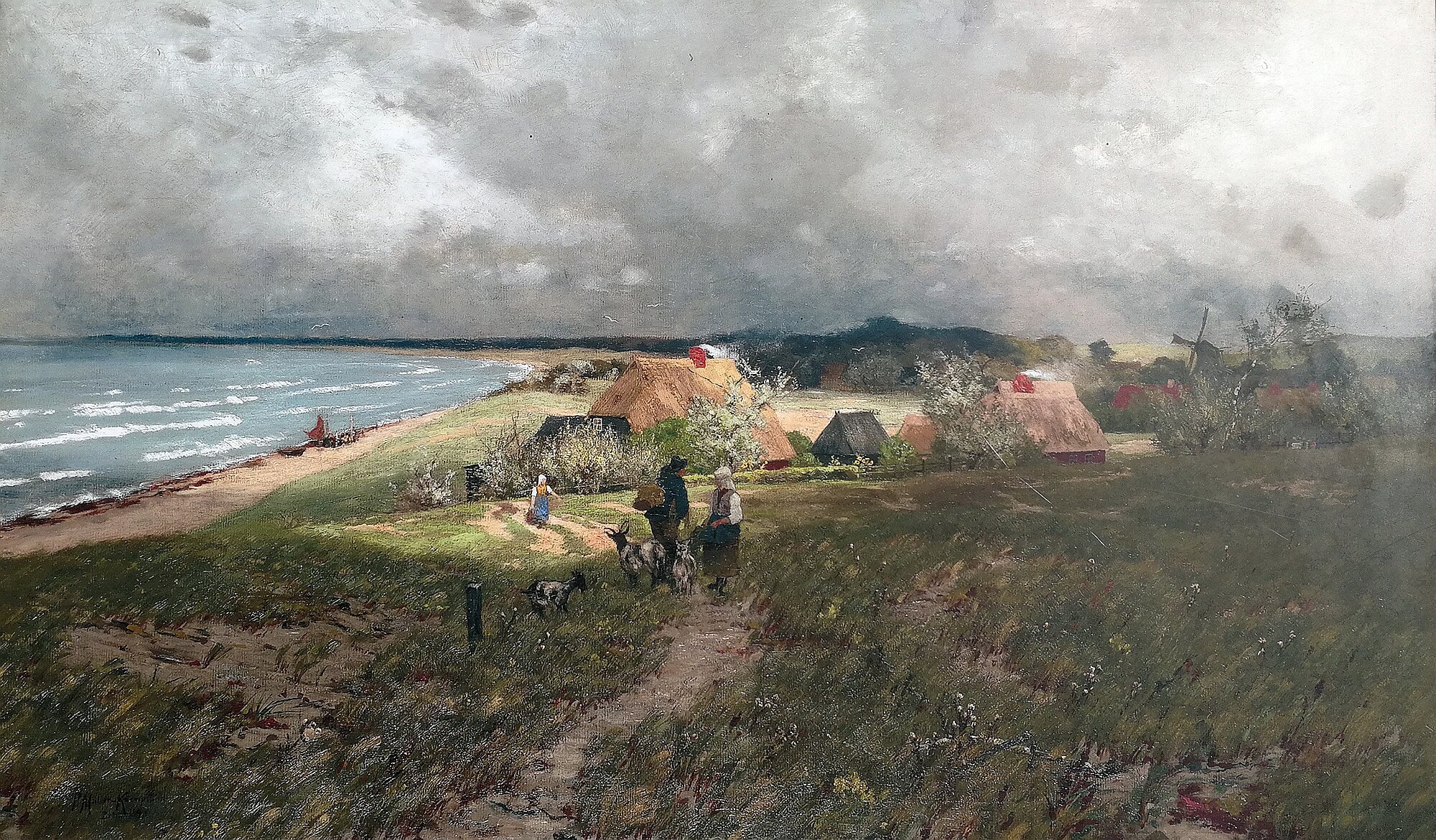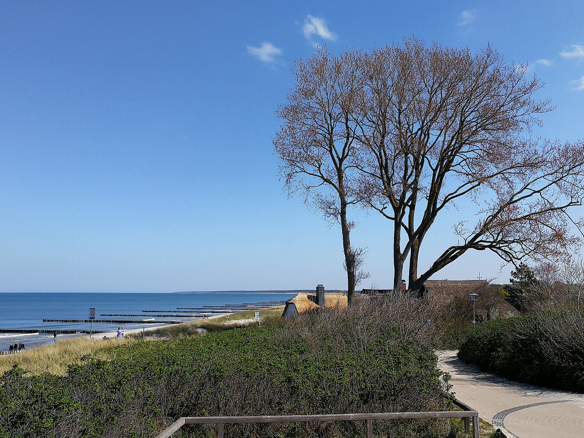 Anschließend wanderte ich vorbei am Aussichtspunkt Bakelberg nach Ahrenshoop wo ich an einem Aussichtspunkt einen schönen Blick auf die Küstenlandschaft hatte. Dort war auch eine Bild des Künstlers Paul Müller-Kaempff aus dem Jahr 1890 zu bewundern, das die gleiche Stelle zeigte. Der Weg führte mich dann durch Ahrenshoop mit schönen alten Häusern zum Ortsausgang und weiter auf dem Deich zum Vorderdarß.