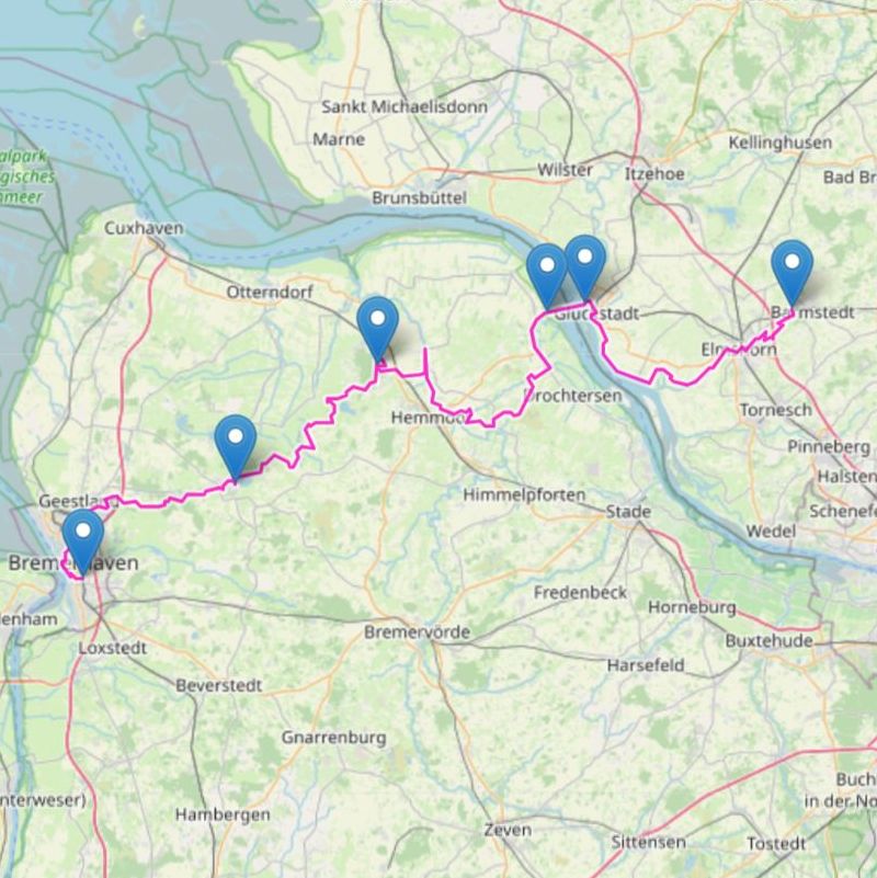 Im Juli 2003 habe ich endlich die Wanderung auf dem Europawanderweg E9 zwischen Elbe und Weser zu begonnen. Ursprünglich als 3-Tagestour von der Fähre in Wischhafen an geplant musste ich die 3. Etappe in Richtung Bremerhaven abbrechen, konnte sie aber im August 2003 nachholen. Die 4. Etappe beginnend bei der Glückstädter Fähre bin ich über Elmshorn nach Voßloch gewandert. Von dort hatte ich die weitere Strecke nach Blankenese schon im Rahmen meiner E1a - SEE-Wanderung geschafft.